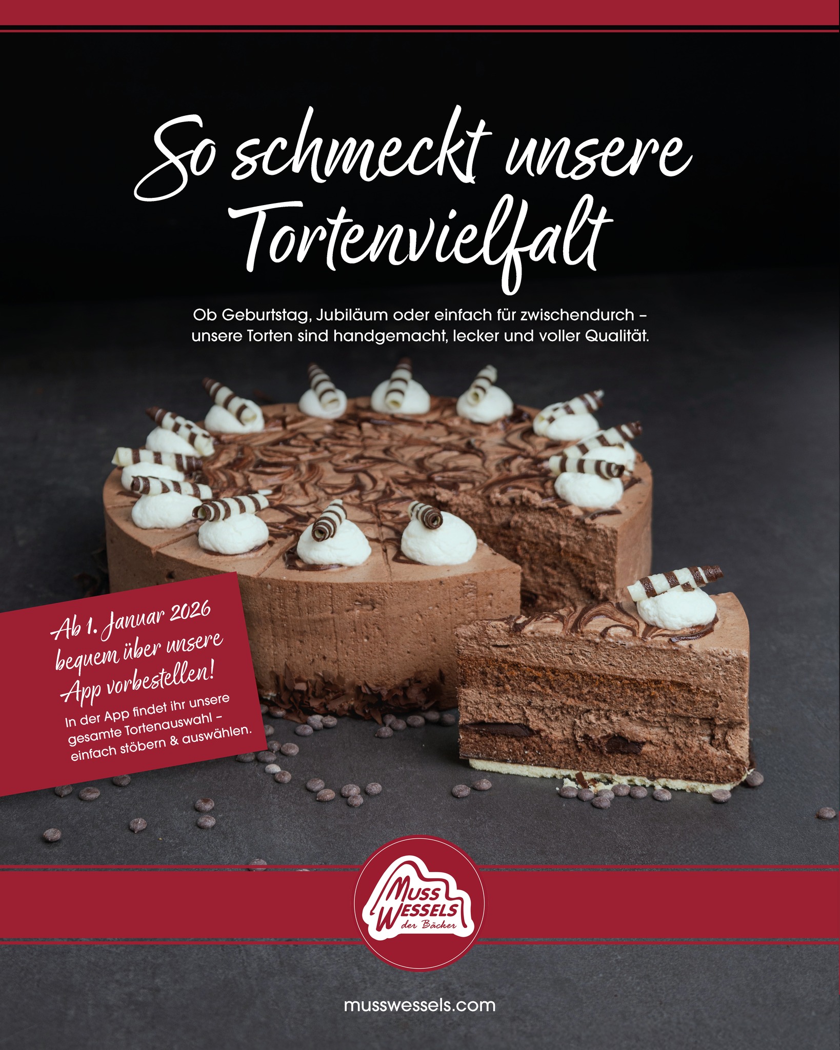 Ab dem 1. Januar 2026 könnt ihr eure Lieblingstorten ganz bequem über unsere Musswessels App vorbestellen!