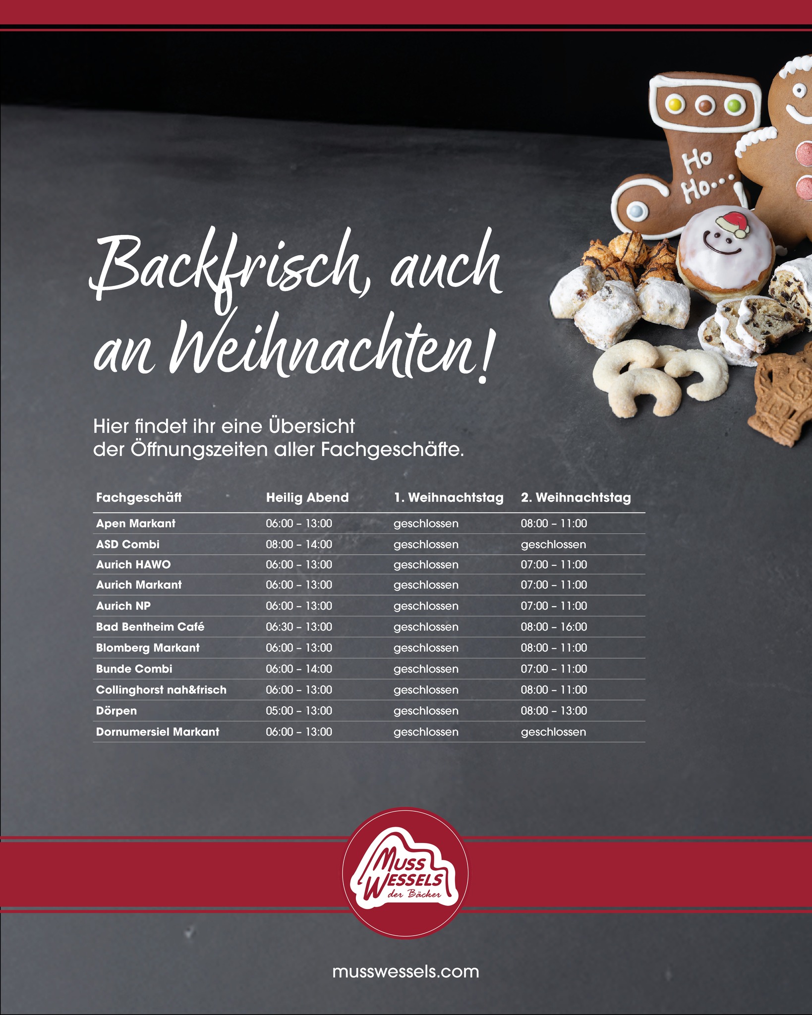 Die festliche Zeit rückt näher und wir möchten euch natürlich auch rund um die Feiertage mit leckeren Backwaren, herzlichem Service und echter Qualität