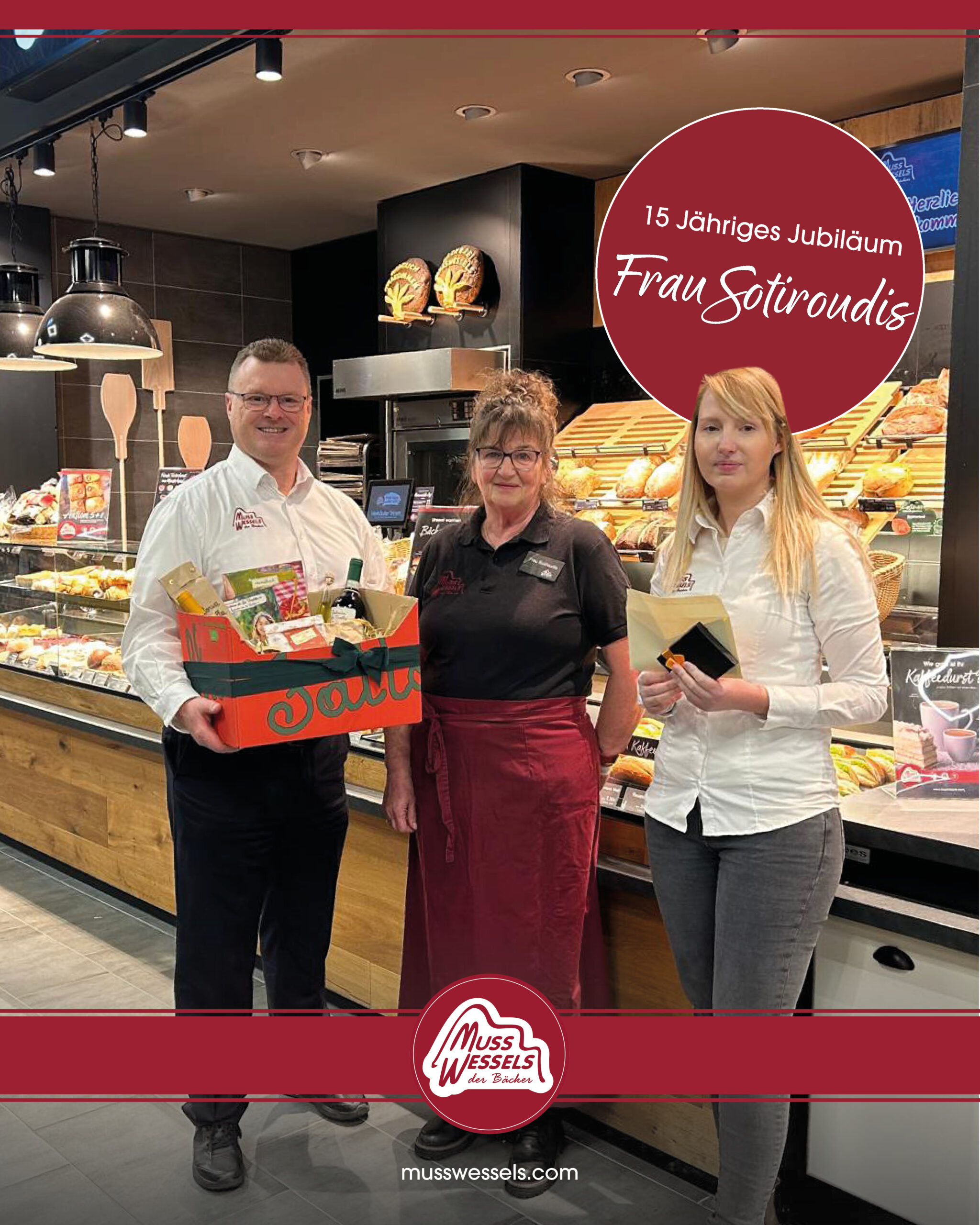 Seit ganzen 15 Jahren ist Frau Sotiroudis Teil unserer Musswessels-Familie und bringt täglich ein Lächeln an den Standort Emden Hauptbahnhof. Mit ihrer herzlichen Art, ihrem Einsatz und ihrer Liebe zu unseren leckeren Backwaren ist sie ein echtes Vorbild für uns als Team und für viele unserer Gäste, die sie seit Jahren kennen und schätzen.