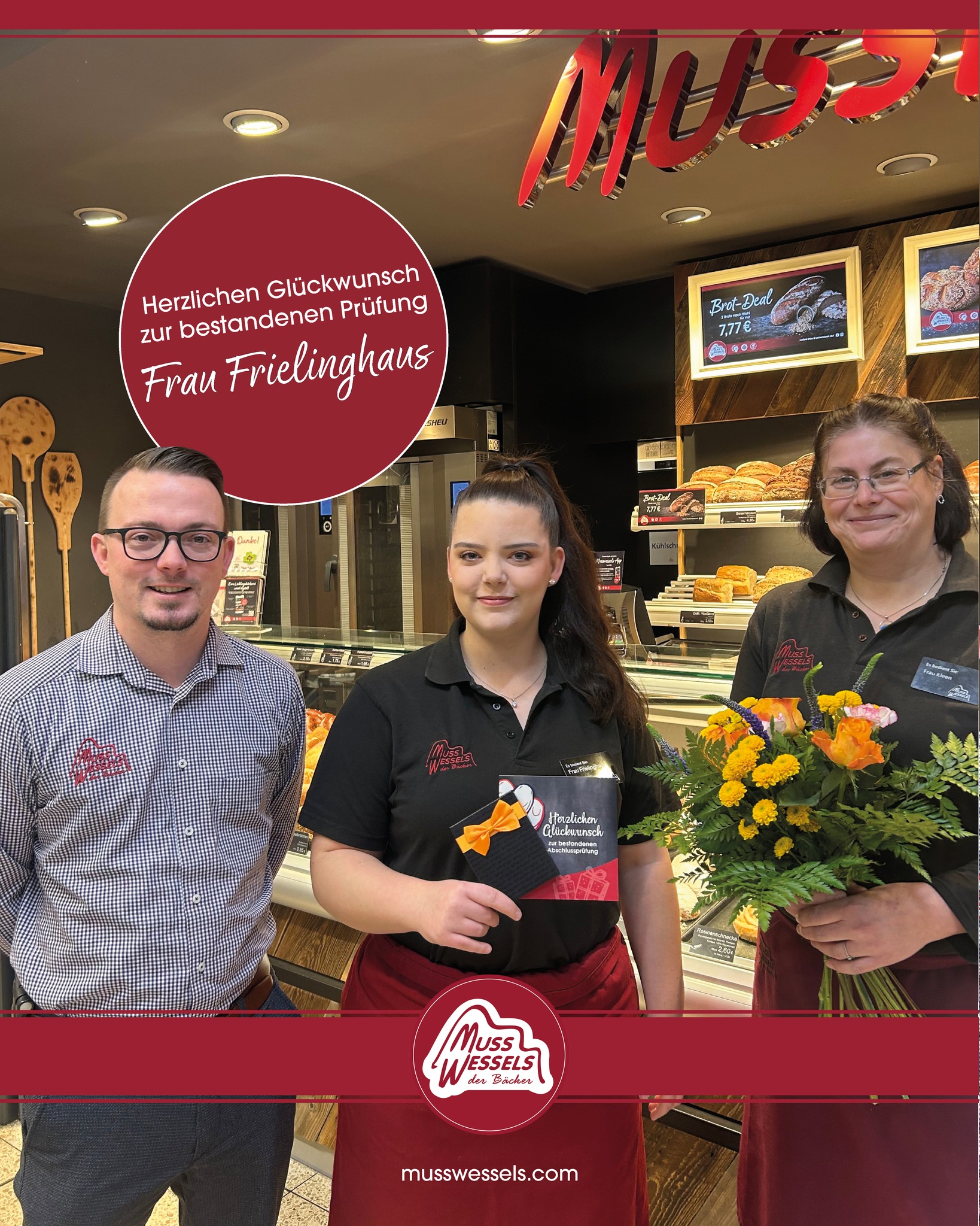 Frau Frielinghaus hat ihre auf 2,5 Jahre verkürzte Ausbildung zur Fachverkäuferin im Lebensmittelhandwerk (Fachrichtung Bäckerei) erfolgreich abgeschlossen. Wir freuen uns sehr, dass sie auch weiterhin Teil unserer Musswessels-Familie bleibt: Nach der erfolgreich bestandenen Prüfung wurde sie in ein unbefristetes Arbeitsverhältnis übernommen. Mit ihrer Erfahrung und ihrem Engagement wird Frau Frielinghaus zukünftig unser Team in Dornumersiel während der Saison unterstützen und bei Neueröffnungen im Bezirk tatkräftig mitwirken. ☺️