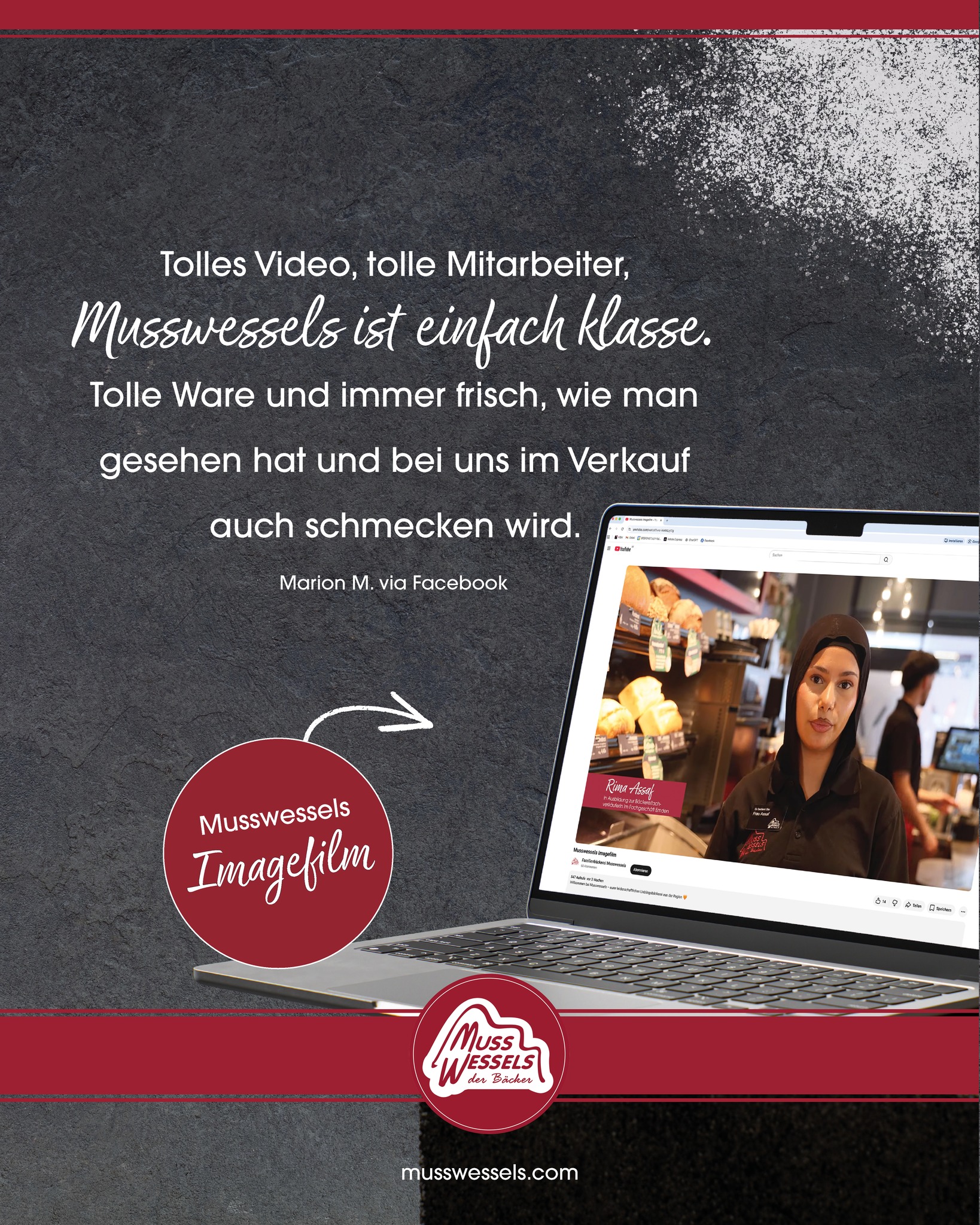Ein herzliches Dankeschön an Marion M. für diese wunderbaren Worte auf Facebook: „Tolles Video, tolle Mitarbeiter, Musswessels ist einfach klasse, tolle Ware und immer frisch, wie man gesehen hat und bei uns im Verkauf auch schmecken wird!“