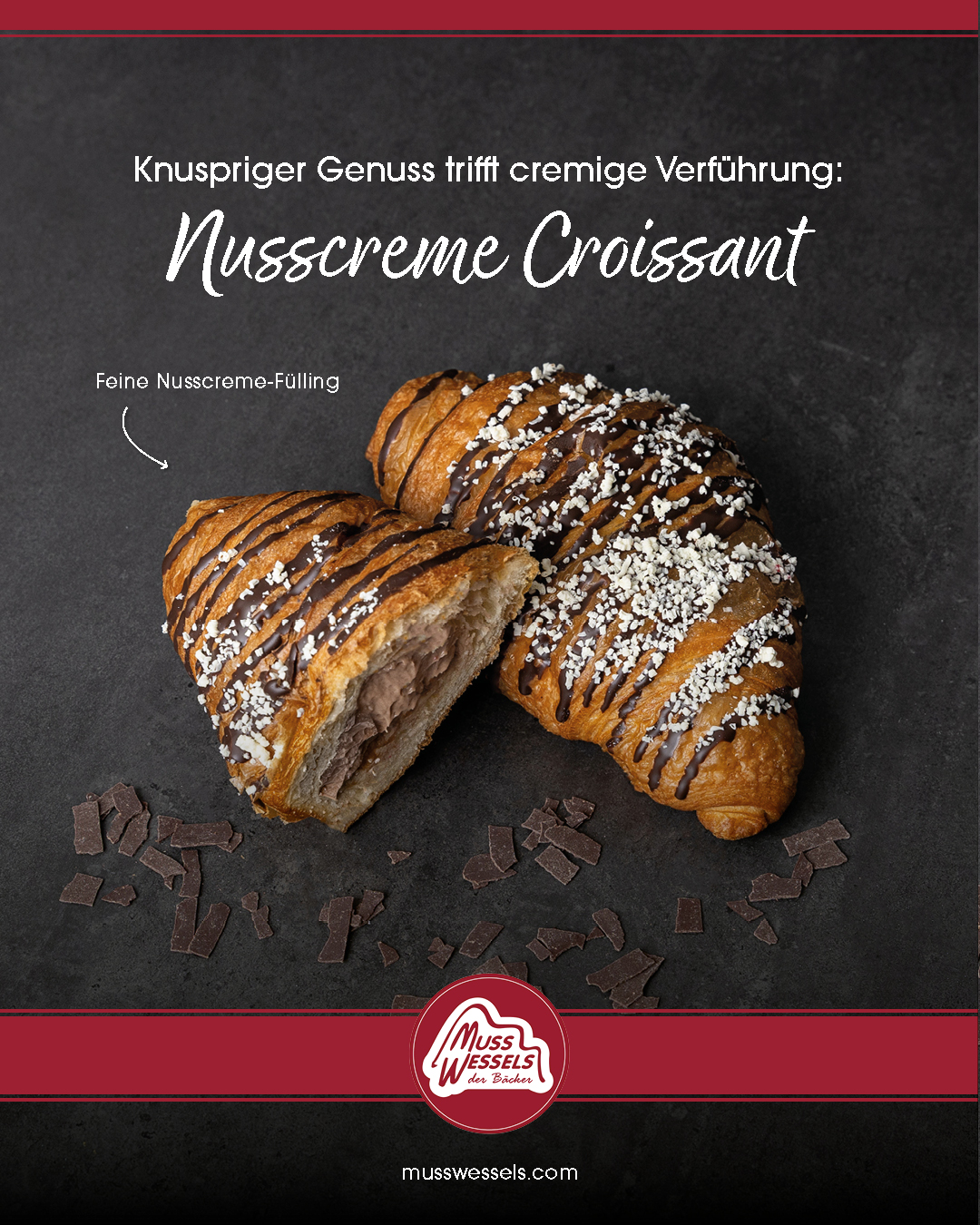 Mit jedem Biss in unser Nusscreme Croissant erlebt ihr, was echte Qualität bedeutet. Außen goldbraun und herrlich knusprig gebacken, innen gefüllt mit einer zartschmelzenden Nusscreme – ein Genussmoment, der euch den Tag versüßt.