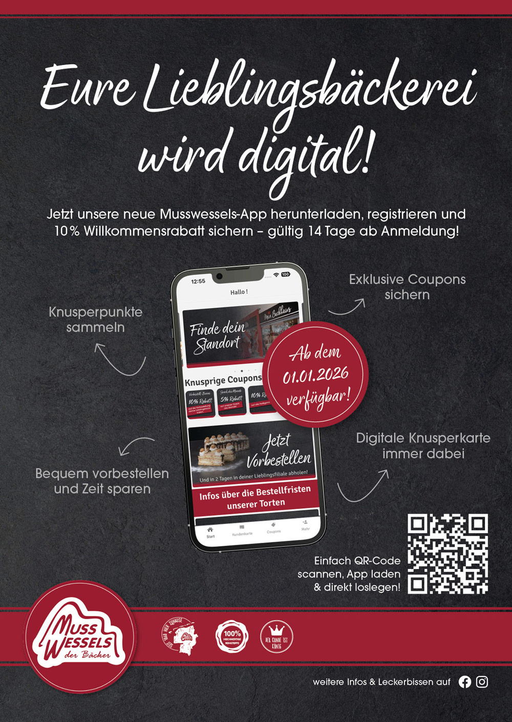 unsere physische Vorteilskarte wird zum 31.12.2025 eingestellt und erstetzt durch unsere neue „Musswessels-App“. Die App finden Sie ab dem 01.01.2026 im Google Play Store oder im App Store von Apple unter „Bäckerei Musswessels“. Freuen Sie sich auf viele tolle neue Funktionen und einzigartige Möglichkeiten zum sparen.